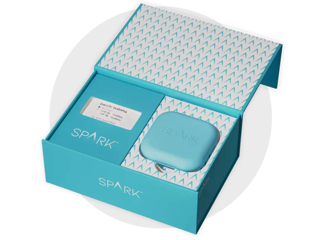 Os Alinhadores Spark™, feitos a partir de plástico transparente, alinham os dentes gradualmente com uma força suave, movendo-os da posição atual para a desejada.